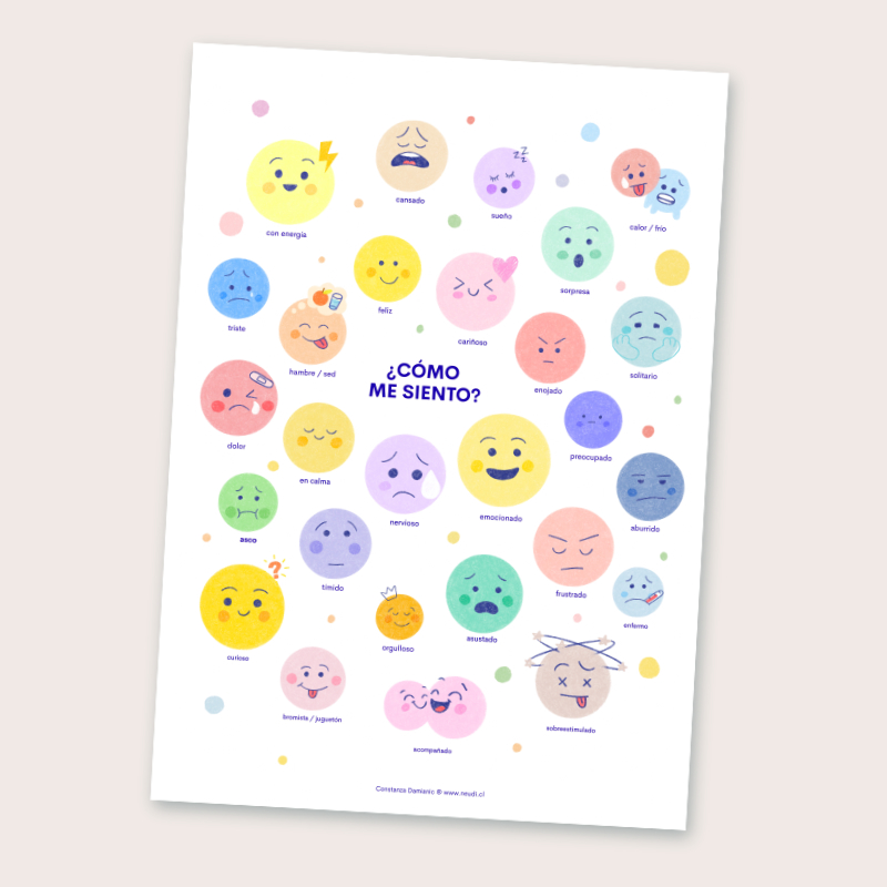 Al adquirirlo, recibirás un archivo en PDF de alta resolución, listo para imprimir, que contiene 27 ilustraciones claras de estados emocionales básicos, necesidades fisiológicas y sensaciones sensoriales: Emocionado, enojado, bromista / juguetón, enfermo, sueño, con energía, hambre / sed, dolor, feliz, orgulloso, acompañado, frustrado, triste, solitario, aburrido, preocupado, tímido, sorpresa, asco, sobreestimulado, calor / frío, cansado, en calma, curioso, cariñoso, asustado, nervioso.